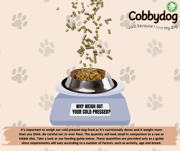 It’s important to weigh our cold pressed dog food as it’s nutritionally dense and it weighs more than you think. Be careful not to over feed, the quantity will look small in comparison to a raw or kibble diet.