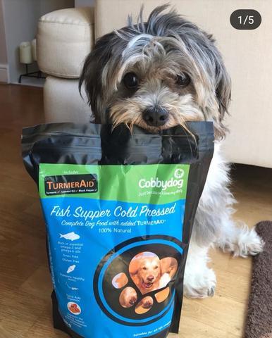 This is a cold pressed dog food which contains added TurmerAid. Cold pressed food conserves nutrients but is like feeding a dry food and is nutritionally dense, so you don’t feed as much as you would kibble. The fact that it is combined with TurmerAid has been really useful, as Turmeric has amazing health benefits but I could never find a way of getting Archie to eat it!.