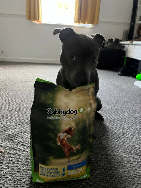 "This is 8 month old Misty the blue staffy (known as the aggressive lover, as she loves to dive bomb you and kiss your whole face 😂) she’s been on Cobbydog now for around 3 months and she loves it! This month we’re trying out the fish flavour instead of duck to give her some variety ☺️" Shayna